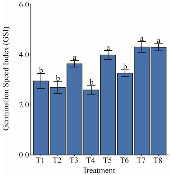 Effect of different hydropriming treatments on the germination speed index (GSI) of maize seeds. Lowercase letters indicate statistically significant differences among hydropriming treatments, as determined by the Scott–Knott test (p < 0.05). Bars represent the mean, and whiskers represent the associated standard error. T1 consisted of maize seed priming with distilled water (H2O), T2 with phosphate buffer. T3 involved priming with distilled water, T4 with phosphate buffer, T5 with ammonium oxalate, T6 with a combination of ammonium oxalate and phosphate buffer, T7 with ammonium niobate (V) oxalate, and T8 with a combination of ammonium niobate (V) oxalate and phosphate buffer.