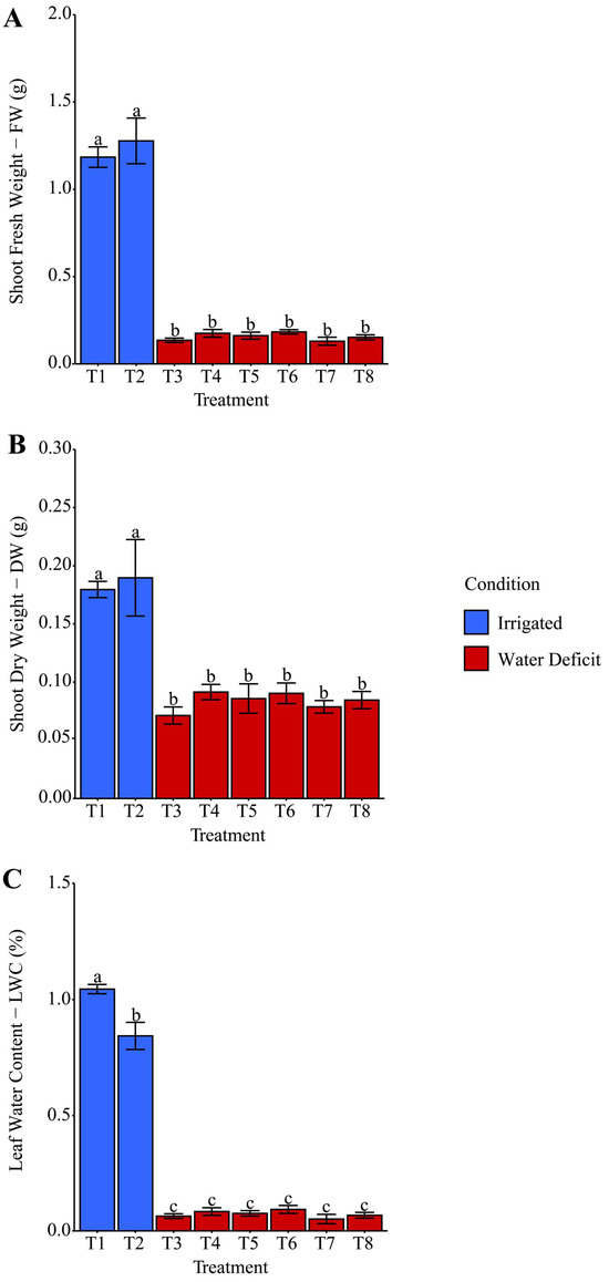 Effect of different hydropriming treatments on (A) shoot fresh weight (FW), (B) shoot dry weight (DW), and (C) leaf relative water content (LWC) of maize seedlings under water deficit. Lowercase letters indicate statistically significant differences among the various hydropriming treatments, as determined by the Scott–Knott test (p < 0.05). Bars represent the mean, and whiskers represent the associated standard error. Under irrigation conditions, treatment T1 consisted of hydropriming maize seeds with distilled water (H2O), while treatment T2 used a phosphate-buffer solution. Under water deficit conditions, treatments involved hydropriming with distilled water (T3), phosphate buffer (T4), ammonium oxalate (T5), a combination of ammonium oxalate and phosphate buffer (T6), ammonium niobate (V) oxalate (T7), and a combination of ammonium niobate (V) oxalate and phosphate buffer (T8).