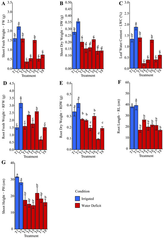Effect of different hydropriming treatments on (A): shoot fresh weight (FW), (B) dry weight (DW), (C) leaf relative water content (LWC), (D) root fresh weight (RFW), (E) dry weight (RDW), (F) root length (RL), (G) shoot height (PH) of maize after rehydration. Lowercase letters indicate statistically significant differences among the various hydropriming treatments, as determined by the Scott–Knott test (p < 0.05). Bars represent the mean, and whiskers represent the associated standard error. Under irrigation conditions, treatment T1 consisted of hydropriming maize seeds with distilled water (H2O), while treatment T2 used a phosphate-buffer solution. Under water deficit conditions, treatments involved hydropriming with distilled water (T3), phosphate buffer (T4), ammonium oxalate (T5), a combination of ammonium oxalate and phosphate buffer (T6), ammonium niobate (V) oxalate (T7), and a combination of ammonium niobate (V) oxalate and phosphate buffer (T8).