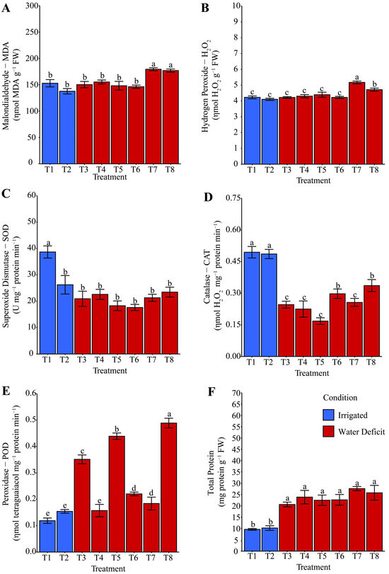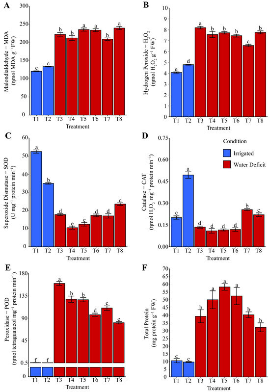 Effect of different hydropriming treatments on (A) malondialdehyde (MDA), (B) hydrogen peroxide (H2O2) contents, the activities of the antioxidant enzymes (C) superoxide dismutase (SOD), (D) catalase (CAT), (E) peroxidase (POD), and (F) total proteins in maize plants after rehydration. Lowercase letters indicate statistically significant differences between hydropriming treatments, as determined by the Scott–Knott test (p < 0.05). Bars represent the mean, and whiskers represent the associated standard error. Under irrigation conditions, treatment T1 consisted of hydropriming maize seeds with distilled water (H2O), while treatment T2 used a phosphate-buffer solution. Under water deficit conditions, treatments involved hydropriming with distilled water (T3), phosphate buffer (T4), ammonium oxalate (T5), a combination of ammonium oxalate and phosphate buffer (T6), ammonium niobate (V) oxalate (T7), and a combination of ammonium niobate (V) oxalate and phosphate buffer (T8).