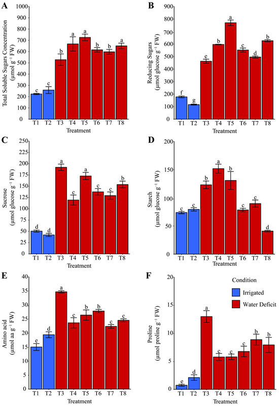 Effect of different hydropriming treatments on the levels of (A) total soluble sugars (TSS), (B) reducing sugars, (C) sucrose, (D) starch, (E) total free amino acids, and (F) proline in maize seedlings under water deficit. Lowercase letters indicate statistically significant differences among the various hydropriming treatments, as determined by the Scott–Knott test (p < 0.05). Bars represent the mean, and whiskers represent the associated standard error. Under irrigation conditions, treatment T1 consisted of hydropriming maize seeds with distilled water (H2O), while treatment T2 used a phosphate-buffer solution. Under water deficit conditions, treatments involved hydropriming with distilled water (T3), phosphate buffer (T4), ammonium oxalate (T5), a combination of ammonium oxalate and phosphate buffer (T6), ammonium niobate (V) oxalate (T7), and a combination of ammonium niobate (V) oxalate and phosphate buffer (T8).