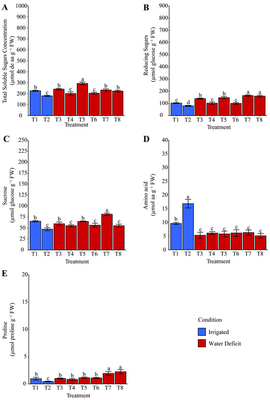 Effect of different hydropriming treatments on the levels of (A) total soluble sugars (TSS), (B) reducing sugars, (C) sucrose, (D) total free amino acids, and (E) proline in maize plants after rehydration. Lowercase letters indicate statistically significant differences among the various hydropriming treatments, as determined by the Scott–Knott test (p < 0.05). Bars represent the mean, and whiskers represent the associated standard error. Under irrigation conditions, treatment T1 consisted of hydropriming maize seeds with distilled water (H2O), while treatment T2 used a phosphate-buffer solution. Under water deficit conditions, treatments involved hydropriming with distilled water (T3), phosphate buffer (T4), ammonium oxalate (T5), a combination of ammonium oxalate and phosphate buffer (T6), ammonium niobate (V) oxalate (T7), and a combination of ammonium niobate (V) oxalate and phosphate buffer (T8).