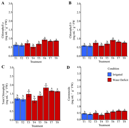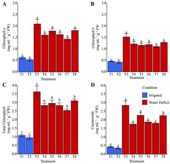 Effect of different hydropriming treatments on the contents of (A) chlorophyll a, (B) chlorophyll b, (C) total chlorophyll, and (D) carotenoids in maize plants after rehydration. Lowercase letters indicate statistically significant differences between hydropriming treatments, as determined by the Scott–Knott test (p < 0.05). Bars represent the mean, and whiskers represent the associated standard error. Under irrigation conditions, treatment T1 consisted of hydropriming maize seeds with distilled water (H2O), while treatment T2 used a phosphate-buffer solution. Under water deficit conditions, treatments involved hydropriming with distilled water (T3), phosphate buffer (T4), ammonium oxalate (T5), a combination of ammonium oxalate and phosphate buffer (T6), ammonium niobate (V) oxalate (T7), and a combination of ammonium niobate (V) oxalate and phosphate buffer (T8).
