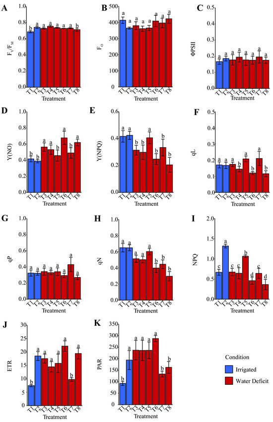 Effect of different hydropriming treatments on the quantity related to the (A) maximum quantum yield of PSII photochemistry (FV/FM), (B) minimum Chl a fluorescence yield in the dark-adapted state (FO), (C) effective quantum yield of PSII (ΦPSII), (D) quantum yield of non-regulated energy dissipation (Y(NO)), (E) quantum yield of regulated energy dissipation via NPQ-dependent mechanisms (Y(NPQ)), (F) photochemical quenching coefficient based on the fraction of open PSII reaction centers (qL), (G) photochemical quenching coefficient based on the ratio between open and closed centers (qP), (H) non-photochemical quenching coefficient (qN), (I) Stern–Volmer non-photochemical quenching (NPQ), and (J) electron transport rate (ETR) under different (K) photosynthetically active radiation (PAR) conditions in maize plants after rehydration. Lowercase letters indicate statistically significant differences among the various hydropriming treatments, as determined by the Scott–Knott test (p < 0.05). Bars represent the mean, and whiskers represent the associated standard error. Under irrigation conditions, treatment T1 consisted of hydropriming maize seeds with distilled water (H2O), while treatment T2 used a phosphate-buffer solution. Under water deficit conditions, treatments involved hydropriming with distilled water (T3), phosphate buffer (T4), ammonium oxalate (T5), a combination of ammonium oxalate and phosphate buffer (T6), ammonium niobate (V) oxalate (T7), and a combination of ammonium niobate (V) oxalate and phosphate buffer (T8).