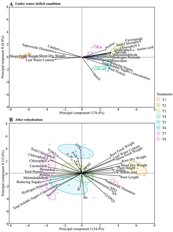 Principal component analysis related to different hydropriming treatments of maize seeds, (A): under water deficit conditions, and (B): after rehydration. ETR: Electron transport rate. PAR: Photosynthetically active radiation. FV/FM: a quantity related to the maximum quantum yield of PSII photochemistry. FO: Minimum Chl a fluorescence yield in the dark-adapted state. qL: Photochemical quenching coefficient based on the fraction of open PSII reaction centers. qP: Photochemical quenching coefficient based on the ratio between open and closed centers. Y(NPQ): Quantum yield of regulated energy dissipation via NPQ-dependent mechanisms. qN: Non-photochemical quenching coefficient. NPQ: Stern–Volmer non-photochemical quenching. Yield PSII (ΦPSII): Effective quantum yield of PSII. T1 consisted of priming maize seeds with distilled water (H2O), T2 with phosphate buffer. T3 involved priming with distilled water, T4 with phosphate buffer, T5 with ammonium oxalate, T6 with a combination of ammonium oxalate and phosphate buffer, T7 with ammonium niobate (V) oxalate, and T8 with a combination of ammonium niobate (V) oxalate and phosphate buffer.