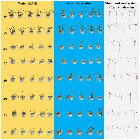 Visualization of the effects of different hydropriming treatments on maize seeds under water deficit conditions and after rehydration, including aspects of the shoot and root system. T1 consisted of maize seed priming with distilled water (H2O), T2 with phosphate buffer. T3 involved priming with distilled water, T4 with phosphate buffer, T5 with ammonium oxalate, T6 with a combination of ammonium oxalate and phosphate buffer, T7 with ammonium niobate (V) oxalate, and T8 with a combination of ammonium niobate (V) oxalate and phosphate buffer.