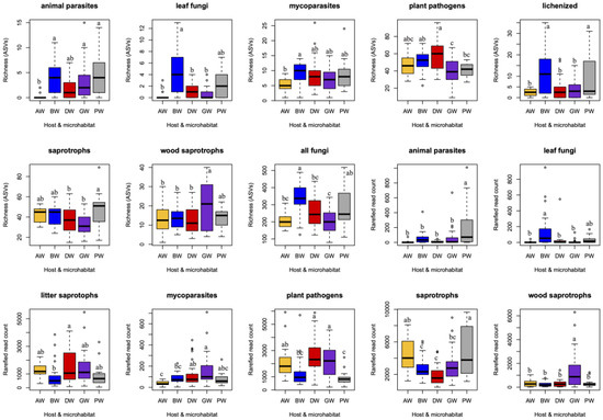 Boxplots showing the ASV richness and rarefied read abundance of functional groups of fungi among wood samples of examined plants, based on the rarefied dataset. Letters indicate significant differences in one-way ANOVA post hoc Tukey HSD test (p < 0.05). Abbreviations: W—wood sample, A—apricot, B—blackthorn, D—dogrose, G—grapevine, P—pear.