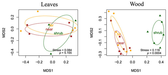 Non-metric multidimensional scaling (NMDS) ordination plots showing the differences in composition of the fungal communities in leaves and wood tissues of grapevine (near and far) and shrubs (blackthorn and dogrose). The ordination was based on a Bray–Curtis distance matrix generated from the abundance table.