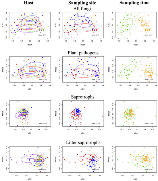 The fungal community composition of dominant functional groups, such as plant pathogens, saprotrophs, litter saprotrophs, and wood saprotrophs, was visualized in a two-dimensional NMDS ordination (Figure 3 and Figure 4). The results of PERMANOVA show that all three factors (host plant, sampling site, sampling time) significantly influenced the composition of fungal communities, both for all fungi and for the dominant functional groups considered separately. The results of all three independent variables were significant for all functional groups tested; the compositional variance results and p-values are summarized in Table 1.