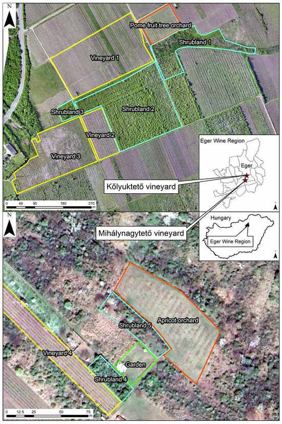 The research areas are located on the outskirts of the city, primarily in the garden zone on the southern side of Eger, where viticulture developed following medieval deforestation and still exhibits a diverse mosaic-like pattern today. The forested, grassland, or residential patches situated in the immediate vicinity of the vineyards create different ecological conditions, which may influence the structure of microbial communities. There are larger areas dedicated exclusively to vineyards, but there are also many smaller garden plots planted with grapevines or other crops, most of which have a house built on them. Thus, sampling was conducted in well-managed vineyards and orchards embedded in a mosaic landscape, where cultivated areas are interspersed with early successional semi-natural habitats dominated by native shrubs such as dogrose and blackthorn. Fruit trees and grapevines have received conventional plant protection, which, in Hungary, typically includes the regular application of fungicides (e.g., copper- and sulfur-based compounds, systemic fungicides), insecticides, and herbicides according to standard agricultural practice.