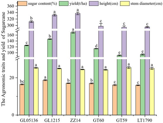 The sugarcane yield, sugar content, and key morphological traits of different varieties are summarized in Figure 1. Plant height varied significantly across the six genotypes, ranging from 294.39 ± 4.41 cm in GT59 to 337.30 ± 3.89 cm in ZZ14. Intermediate heights were observed in GL05136 (311.90 ± 2.71 cm), GL1215 (332.39 ± 2.94 cm), and LT1790 (324.15 ± 3.57 cm), all of which were significantly taller than the two shortest genotypes, GT59 and GT60. In contrast, stem diameter exhibited only minor variation, from 24.29 ± 0.22 mm in GT60 to 25.47 ± 0.52 mm in GT59, with no significant differences detected among the varieties.