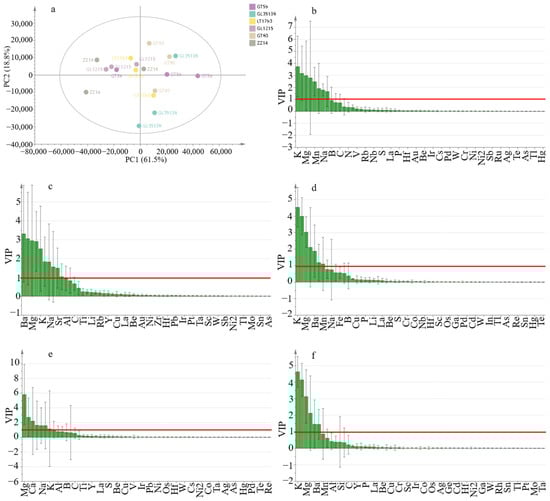 Multivariate ionomic analysis of six sugarcane genotypes. (a) Principal component analysis (PCA) of ionomic profiles showing the clustering patterns of genotypes. (b) OPLS-DA: GT59 vs. LT1790. (c) OPLS-DA: GL05136 vs. GL1215. (d) OPLS-DA: GL05136 vs. GT60. (e) OPLS-DA: GL05136 vs. ZZ14. (f) OPLS-DA: GT59 vs. GT60. Key discriminating elements in each model are indicated by variable importance in projection (VIP) scores, and each dot represents one biological replicate (n = 3 per genotype).