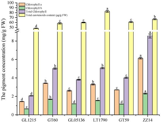 Carotenoid levels also varied substantially, ranging from 48,139.5 ± 484.1 µg/g in GL1215 to 82,572.8 ± 1869.4 µg/g in LT1790, indicating a broader capacity for photoprotection and antioxidant function in the latter. The significant pairwise differences (p < 0.05) suggest that GT60 and LT1790 possess enhanced pigment accumulation, which may contribute to superior photosynthetic efficiency relative to other genotypes.
