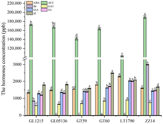 Brassinosteroid (Br) concentrations peaked in ZZ14 (2988.85 ± 19.66 ng/g), suggesting enhanced cell elongation and growth signaling in this genotype. At the same time, GT60 had the lowest Br levels (1105.70 ± 31.14 ng/g), potentially reflecting reduced brassinosteroid biosynthesis or heightened catabolism. Gibberellin (GA3) levels also differed significantly, with LT1790 having the highest content (903.26 ± 6.04 ng/g), indicative of enhanced shoot elongation capacity, while GL1215 exhibited the lowest levels (566.94 ± 5.05 ng/g).