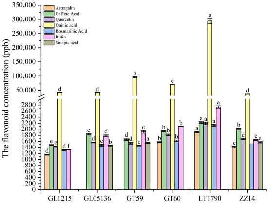 Interestingly, Astragalin and Coumaric acid were undetectable in GL05136 and GT59, suggesting possible metabolic trade-offs or pathway suppression in these varieties. Meanwhile, GL1215 and GT60 generally exhibited intermediate levels across most flavonoids, reflecting a more balanced but less specialized flavonoid profile.