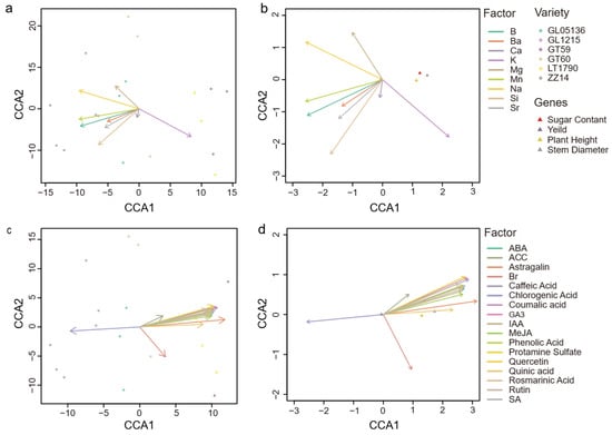 Canonical correlation analysis (CCA) linking yield-related traits with (a,b) ionomic and (c,d) metabolite data in sugarcane. Separate CCA models were constructed using (a,b) mineral element (ionomic) variables and (c,d) phytohormone/metabolite variables to examine their relationships with yield components. Panels (a,c) show biplots including genotype samples, where each dot represents one biological replicate (n = 3 per genotype). Panels (b,d) display biplots of variable loadings and yield components (arrows). Vectors indicate the direction and strength of associations with the canonical axes.