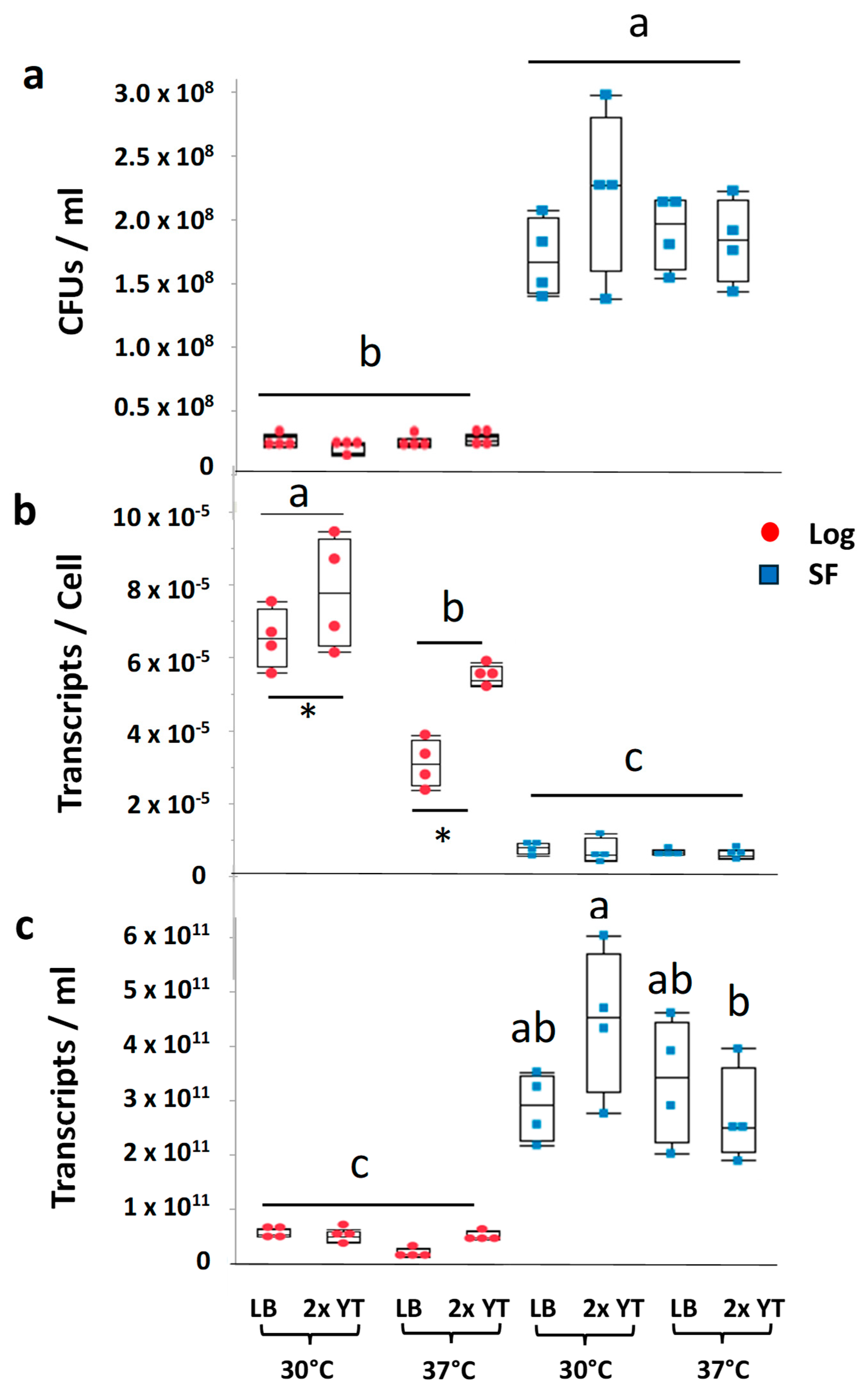 2.1. Influence of Growth Phase and Growth Conditions on the Number of Viable B. subtilis Cells Ectopic Transcripts per Cell