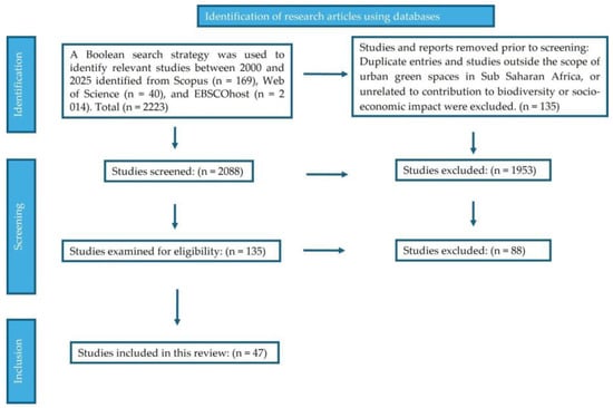 Urbanization challenges environmental sustainability, biodiversity, and climate resilience. Replacement of vegetation and permeable soils with heat-absorbing asphalt, concrete, brick, glass, tiles, and metal [1] drives the urban heat island effect, resulting in increasing temperatures and stormwater runoff, and loss of habitats and biodiversity [2]. Land subsidence, groundwater contamination and flooding, especially in karstic landscapes, can arise [3]. Compromised urban air quality due to emissions of NOx, ozone, and particulate matter has become a significant concern for public health [4,5,6]. Anthropogenic climate change, with more frequent, intense heatwaves and storms, will exacerbate the problems of stormwater runoff, air-, water- and soil pollution, and urban heat [7]. The role of urban gardens, parks, urban forests, green roofs, permeable surfaces, wetlands, and green corridors is gaining attention [8,9]. Urban gardening in this review refers to the cultivation of food- and non-food plants in urban and peri-urban areas, using spaces managed for ecological, nutritional, or socio-economic benefits. These spaces include home, community, school and vertical gardens, rooftop farms, and small-scale urban agroforestry. In an African context, such gardens are embedded in diverse urban spaces, from densely populated informal settlements to sparsely planned residential neighbourhoods, ranging from household courtyards to community farm plots. This definition frames the scope of our analysis and ensures that both formally planned and informally established green spaces are considered within the broader category of urban gardening.