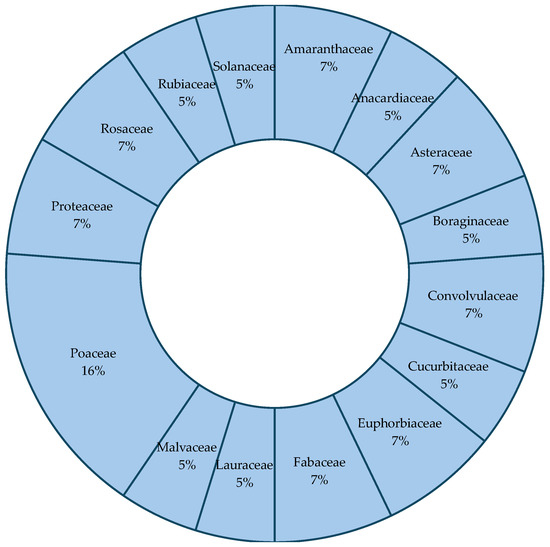 To complement the qualitative synthesis of plant species diversity, we quantified the relative frequency of crop families reported across the reviewed studies. The chart (Figure 3) illustrates the predominance of Poaceae, Fabaceae, Euphabaceae, Proteaceae, Amaranthaceae and Asteraceae, reflecting their multifunctional roles in food production, medicinal use, soil fertility enhancement, and biodiversity support. The distribution highlights the prevalence of nutrient-dense, culturally significant, and ecologically functional crops in urban gardening systems, providing a quantitative synthesis to complement qualitative findings on plant diversity.