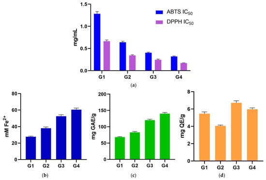 (a) ABTS and DPPH assays (grouped IC50 plots)—pairwise differences were not detected (p > 0.05); (b) FRAP antioxidant assay; (c) TPC assay, underscoring the matched order with FRAP assay; (d) TFC assay stating that all pairwise contrasts were non-significant (p > 0.05). ABTS: 2,2′-Azino-bis(3-ethylbenzthiazoline sulfonic acid); DPPH: 2,2-Diphenyl-1-picrylhydrazyl; FRAP: ferric-reducing antioxidant power; G1: G. dissectum; G2: G. lucidum; G3: G. pussilum; G4: G. robertianum; GAE: gallic acid equivalents; IC50: half-maximal inhibitory concentration; QE: quercetin equivalents; TFC: total flavonoid content; TPC: total phenolic content.