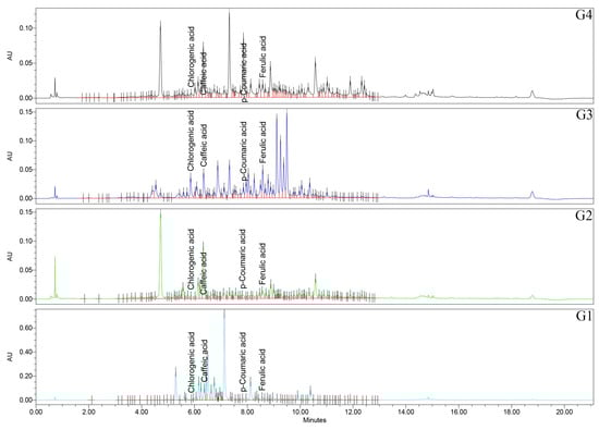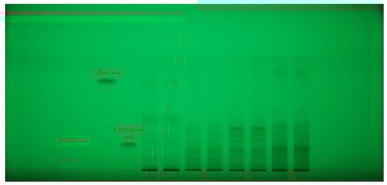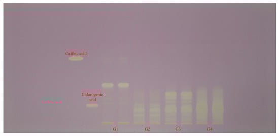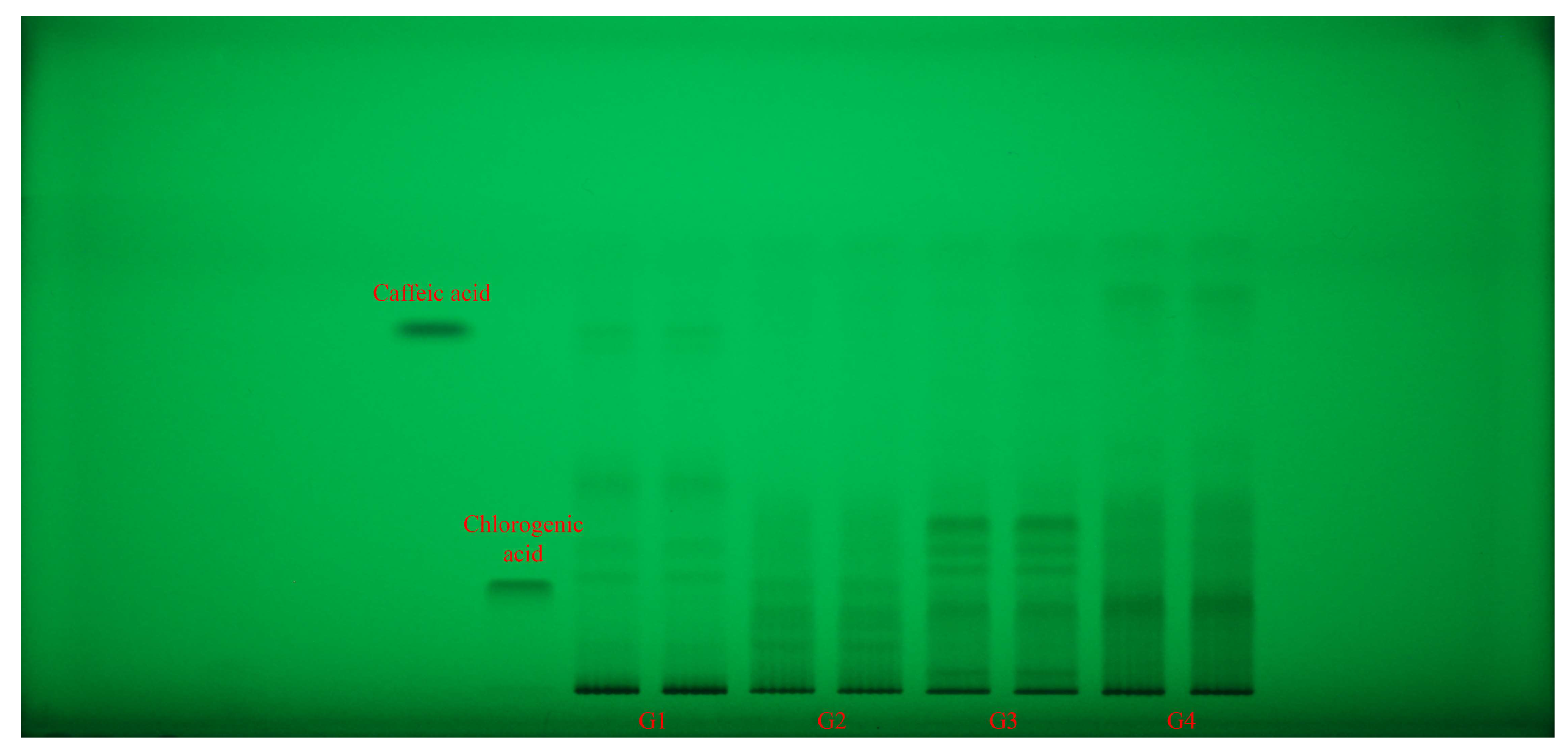 The co-migration of sample bands with the caffeic and chlorogenic acids standards mirrors the UHPLC results: caffeic acid was highest in G1 sample (p < 0.0001 across all pairs), and chlorogenic acid was selectively elevated in G3 sample (G3 > all others, p < 0.0001; the remaining species did not differ). On the plates, the caffeic acid-aligned zone is most intense in G1 sample, and the chlorogenic acid-aligned zone is most intense in G3 sample, exactly as expected. Beyond those two standards, the richer mid-to-upper Rf pattern in G4 sample aligns with its very high p-coumaric acid (all pairwise p < 0.0001) and its elevated gallic acid/protocatechuic acid levels. Conversely, the lower-to-mid Rf emphasis in G1 sample matches its enrichment in caffeic, syringic, and vanillic acids.