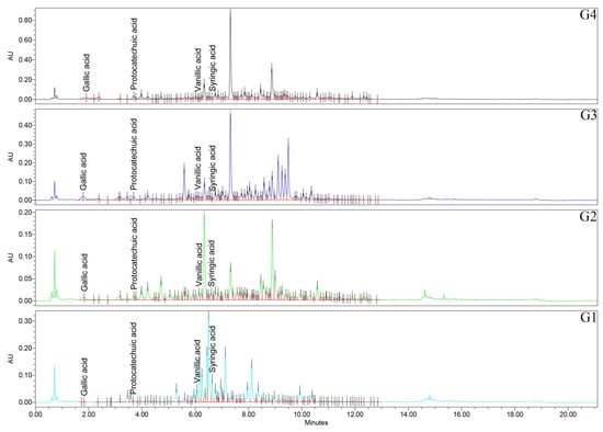 UHPLC/UV (265 nm) chromatograms for Geranium (G1–G4) samples. UHPLC: ultra-high-performance liquid chromatography; UV: ultraviolet.