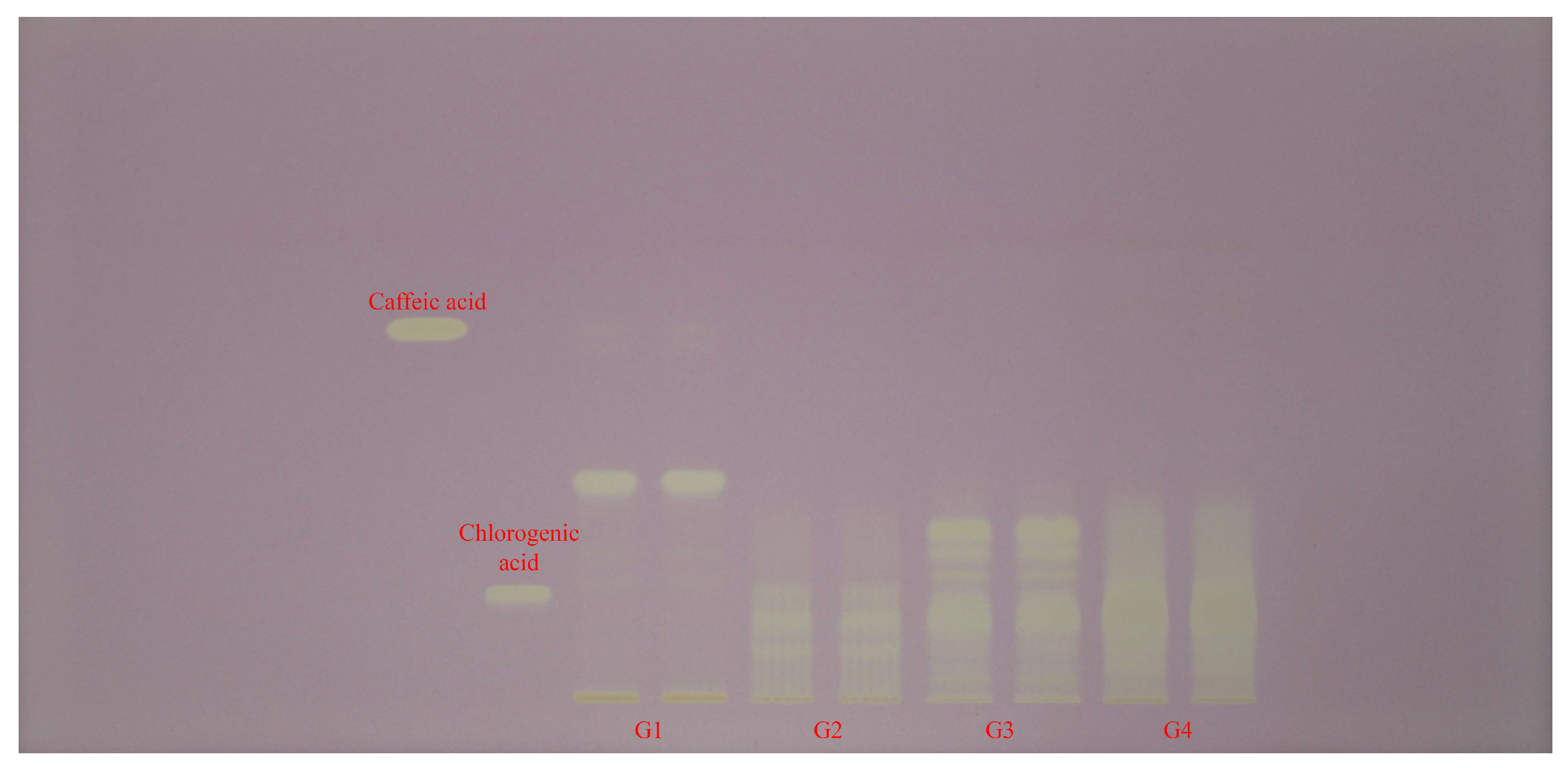 Upon DPPH treatment, all tracks showed distinct bleaching zones, confirming radical scavenging constituents are present in each extract. The number and intensity of bleaching zones were greatest in G4 and G3 samples, distributed across mid and upper Rf regions; G1 sample showed strong bleaching between the caffeic acid and chlorogenic acid positions and weaker, fewer zones elsewhere; G2 sample exhibited a simpler pattern, with fewer, less intense active bands. Notably, a pronounced bleached band at the chlorogenic acid position was prominent in G3 sample, while G4 sample displayed multiple strong bleached bands not co-migrating with caffeic or chlorogenic acids, indicating additional radical scavenging constituents in that extract (Figure 4).