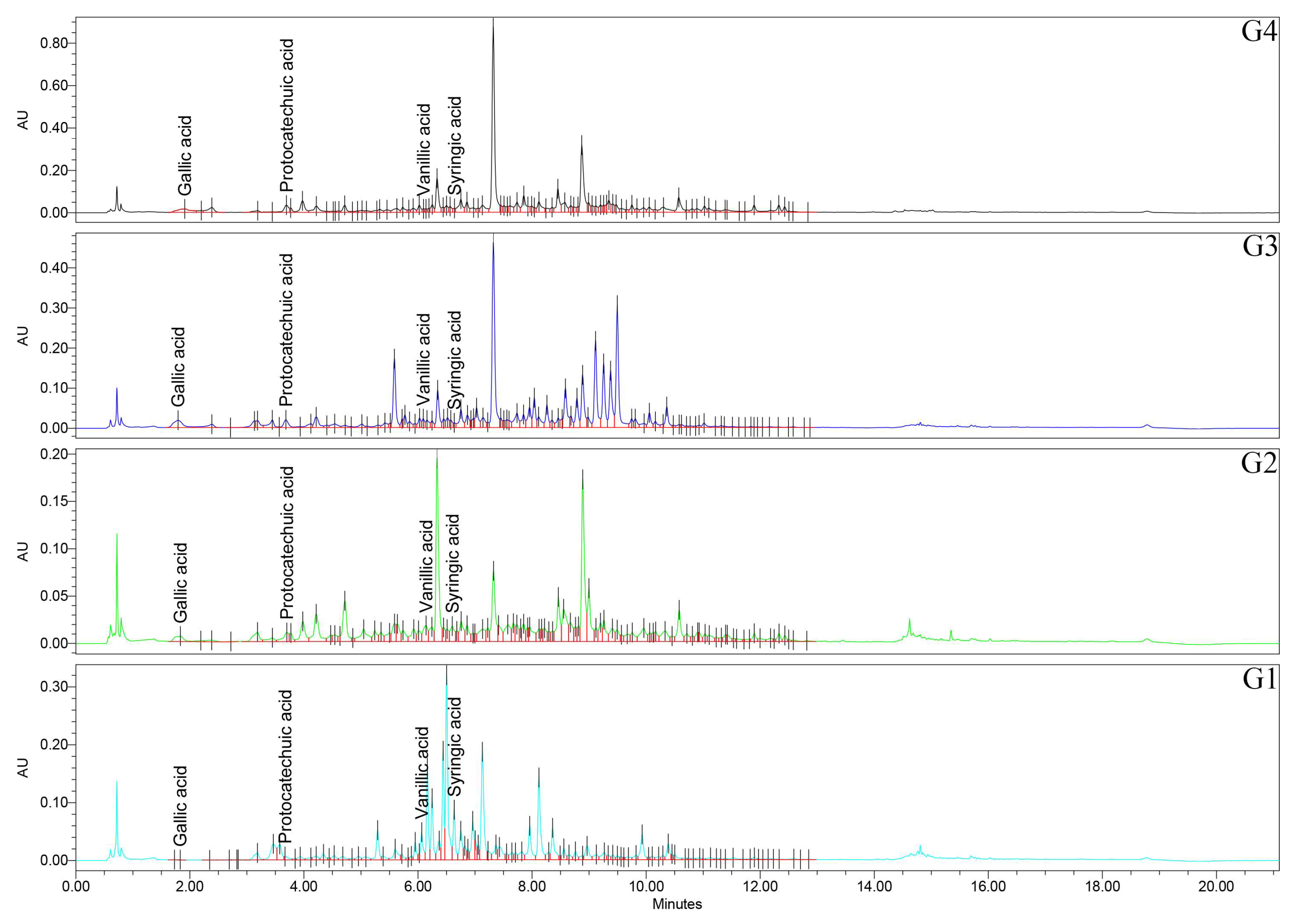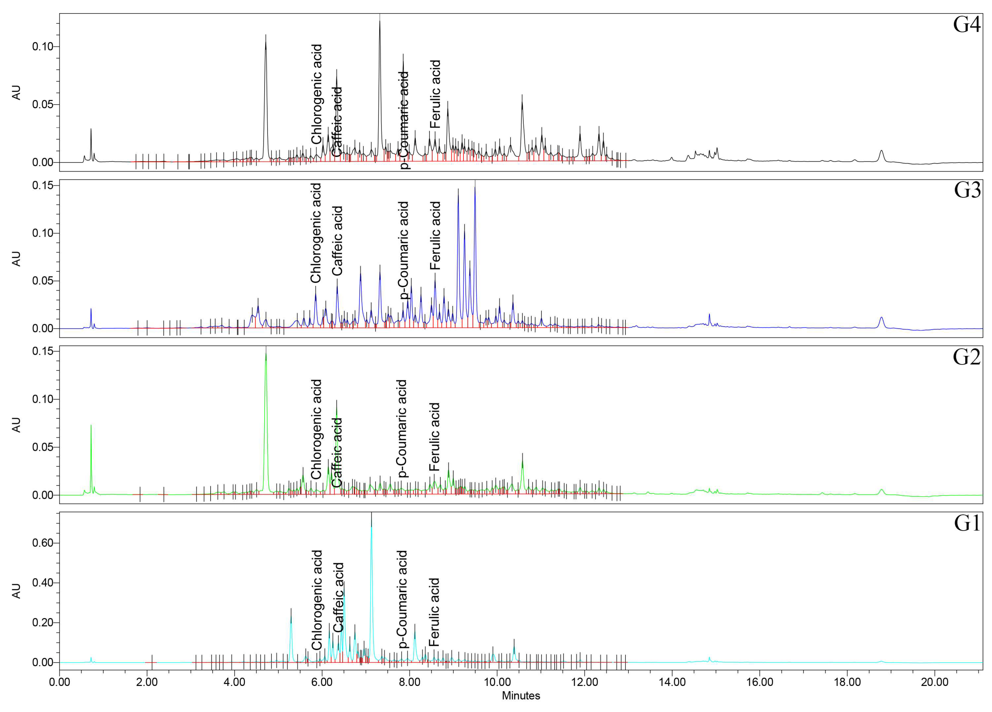 From a practical standpoint, the combination of high TPC, high FRAP, and elevated gallic acid/protocatechuic acid levels makes G4 sample the most promising candidate as a source of antioxidant phenolics in this set, with G3 sample a close second on the basis of both benzoic acids and its distinctive chlorogenic acid/ferulic acid profile. G2 sample sits in an intermediate position, and G1 sample is characterized by low TPC/FRAP together with high syringic acid/vanillic acid and caffeic acid content—features that align with weaker reducing capacity. For applications that value total reducing power and benzoic acid-rich profiles, G4 sample appears to be the best starting point.