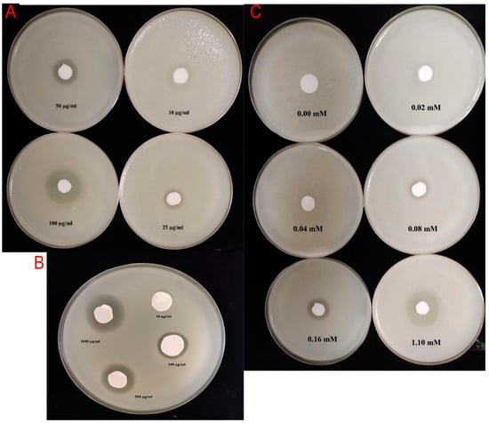 In vitro inhibition of Erwinia amylovora strain Ea06 by different concentrations of (A) oxytetracycline, (B) streptomycin sulfate, and (C) copper sulfate using the agar diffusion assay. Sterile paper disks were impregnated with the indicated concentrations of each compound and placed on nutrient agar plates previously inoculated with a bacterial suspension (≈108 CFU mL−1). Plates were incubated at 28 °C for 48 h, and zones of growth inhibition were recorded as a measure of antibacterial activity. Each treatment was performed in triplicate, and representative plates are shown.