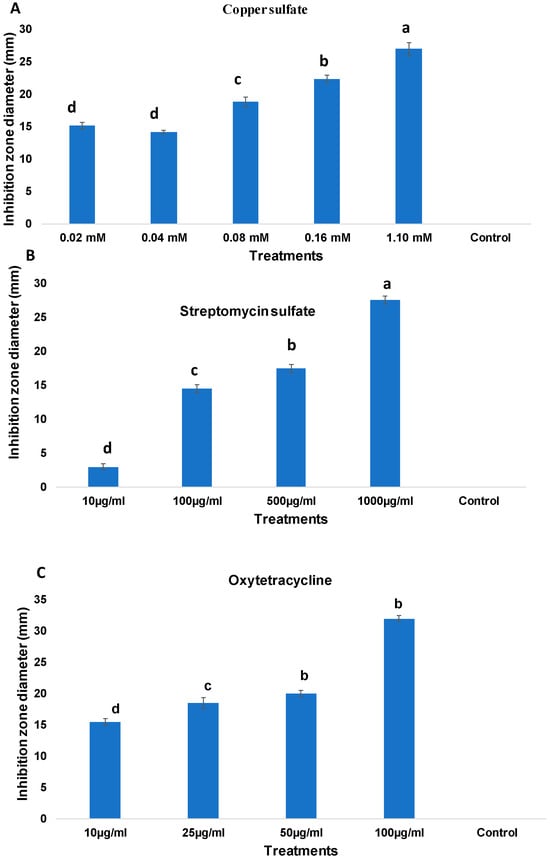 Growth inhibition of Erwinia amylovora strain Ea06 (1 × 109 CFU/mL) by different concentrations of (A) copper sulfate, (B) streptomycin sulfate, and (C) oxytetracycline. Inhibition zones (mm) were measured after 48 h of incubation at 28 °C following the agar disk diffusion assay. Bars represent the mean ± standard error of three independent replicates. Different letters above the bars indicate significant differences among treatments according to Duncan’s multiple range least significant difference (LSD) test at p ≤ 0.05.
