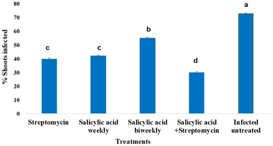 The effectiveness of different treatments in reducing shoot infection was assessed by quantifying the percentage of infected shoots under each condition. As illustrated in Figure 3, the combination of streptomycin and SA resulted in the lowest infection rate (~30%), significantly outperforming all other treatments (p < 0.05). Treatments with either streptomycin or SA alone reduced shoot infection to a similar extent (~40%), both significantly lower than the untreated infected control group, which exhibited the highest infection rate (~65%). Statistical groupings indicated by different letters above the bars confirm significant differences among treatment effects. The combination treatment (streptomycin + SA) formed a distinct group (“c”), reflecting its superior efficacy in suppressing infection, while streptomycin and salicylic acid alone belonged to group “b”. The infected untreated control was categorized as group “a”, underscoring its significantly higher infection level compared to all treatments. These results demonstrate a synergistic effect when streptomycin is combined with salicylic acid, enhancing disease control compared to individual treatments.