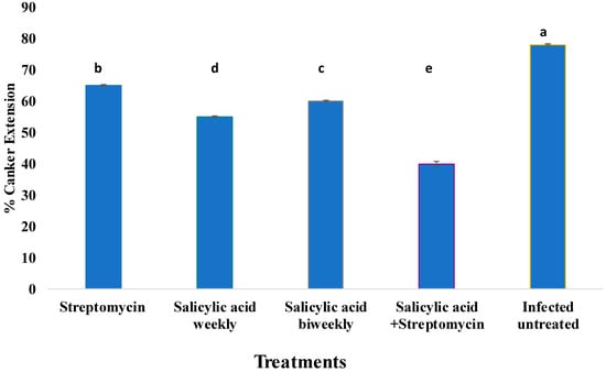 Effect of different treatments on fire blight canker extension in ‘Gala’ apple (Malus domestica) shoots inoculated with Erwinia amylovora strain Ea06 (1 × 109 CFU/mL). Bars represent the mean percentage of canker extension measured two weeks post-inoculation. Treatments included streptomycin, salicylic acid applied weekly or biweekly, a combination of salicylic acid and streptomycin, and an infected untreated control. The combination treatment showed the greatest reduction in canker development compared with all other treatments. Bars with different letters indicate statistically significant differences according to Duncan’s multiple range least significant difference (LSD) test at p ≤ 0.05.