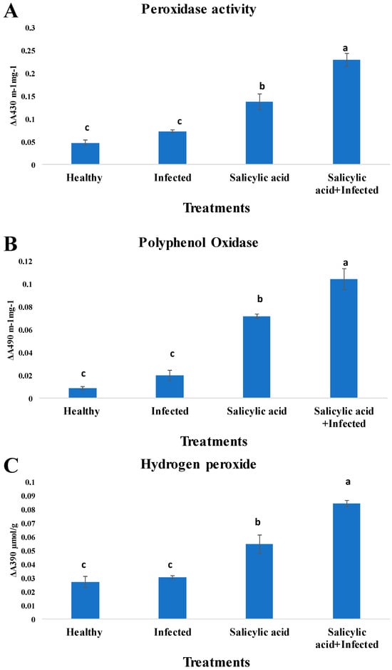 Activities of (A) peroxidase, (B) polyphenol oxidase, and (C) hydrogen peroxide in one-year-old ‘Gala’ apple (Malus domestica) seedlings infected with Erwinia amylovora strain Ea06 (1 × 109 CFU/mL) and treated with salicylic acid under greenhouse conditions. Bars represent mean enzyme activity values, measured as changes in absorbance per unit time. Treatments included healthy control, infected control, salicylic acid alone, and the combination of salicylic acid with infection. Bars sharing the same letter within each panel are not significantly different (p > 0.05) according to Duncan’s multiple range least significant difference (LSD) test at p ≤ 0.05.