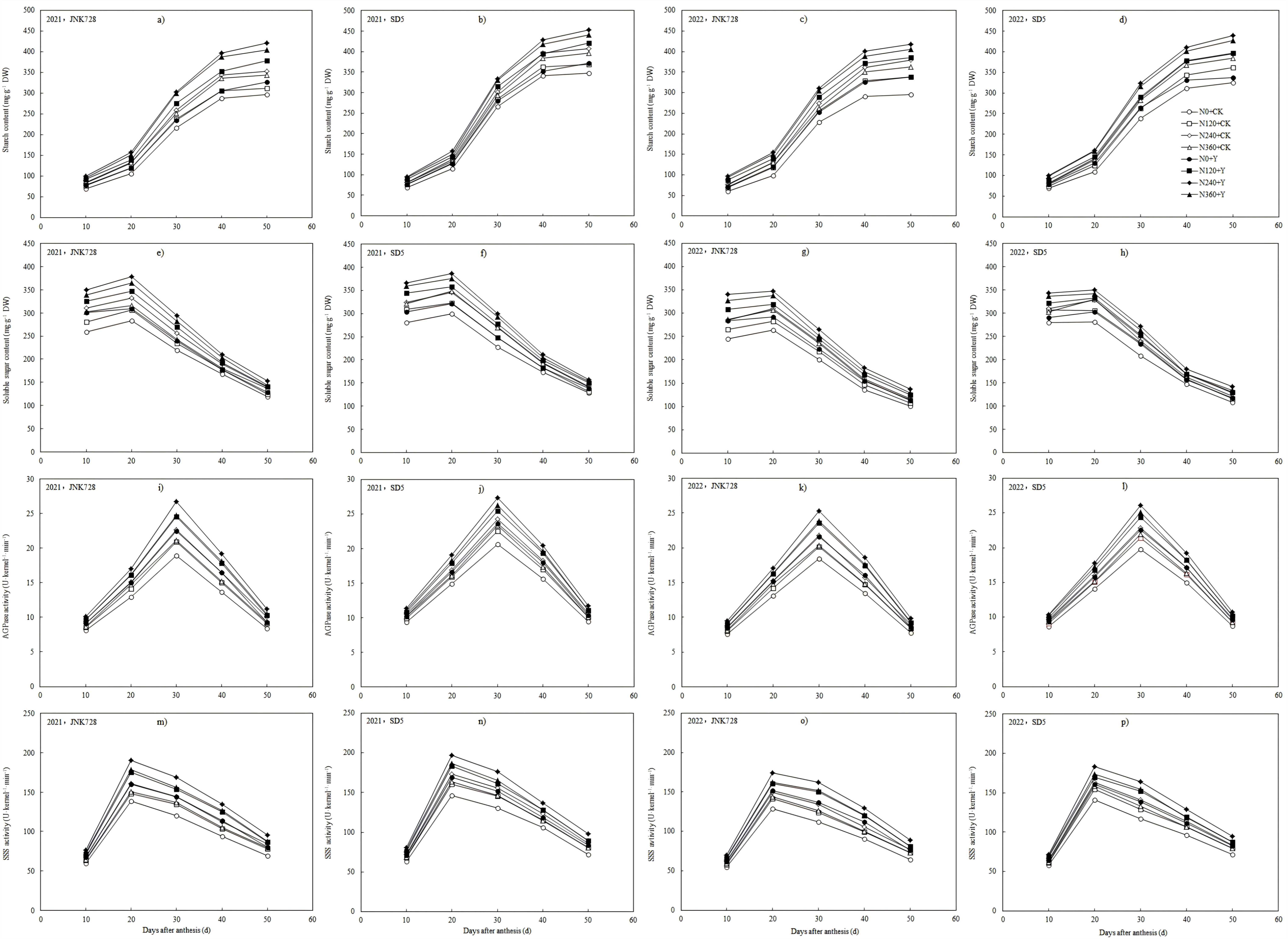 - Feng, W.; Xue, W.; Zhao, Z.; Shi, Z.; Wang, W.; Bai, Y.; Wang, H.; Qiu, P.; Xue, J.; Chen, B. Nitrogen fertilizer application rate affects the dynamic metabolism of nitrogen and carbohydrates in kernels of waxy maize. Front. Plant Sci. 2024, 15, 1416397. [Google Scholar] [CrossRef]