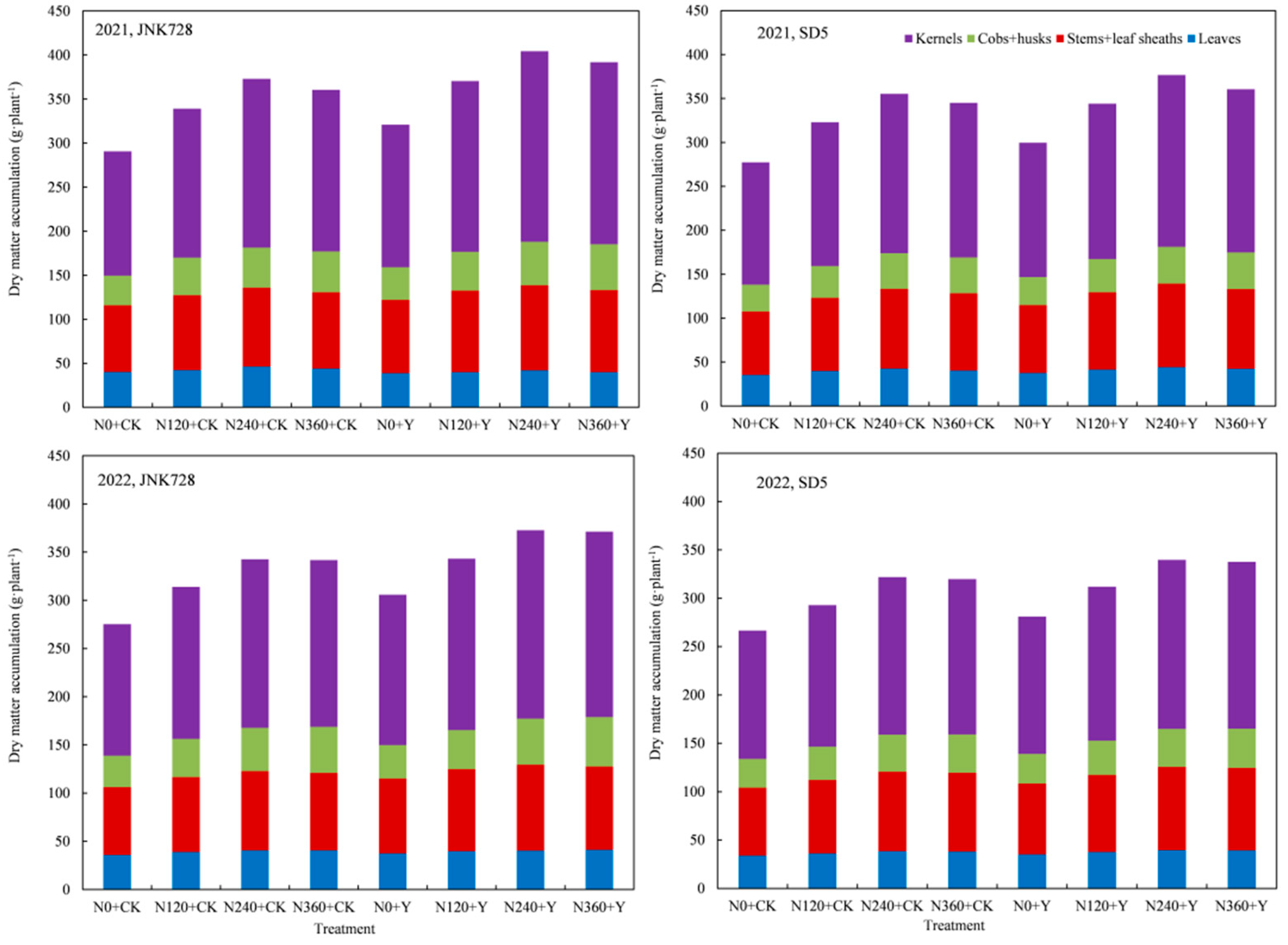- Yang, T.; Zhao, J.; Hong, M.; Ma, M.; Ma, S.; Yuan, Y. Optimizing water and nitrogen supply can regulate the dynamics of dry matter accumulation in maize, thereby promoting dry matter accumulation and increasing yield. Field Crops Res. 2025, 326, 109837. [Google Scholar] [CrossRef]
