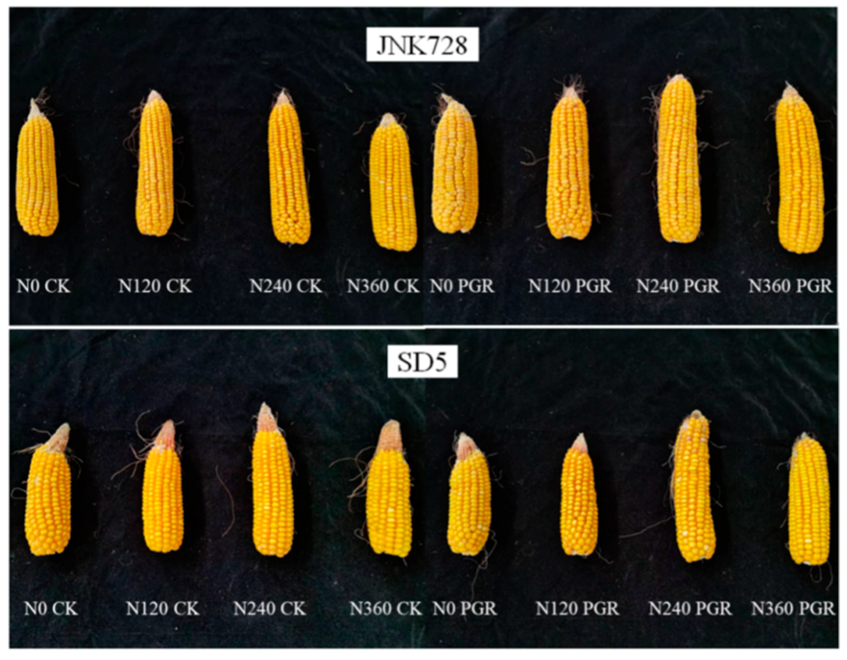 - Yu, T.; Xin, Y.; Liu, P. Effects of 6-benzyladenine (6-BA) on the filling process of maize grains placed at different ear positions under high planting density. Plants 2023, 12, 3590. [Google Scholar] [CrossRef]