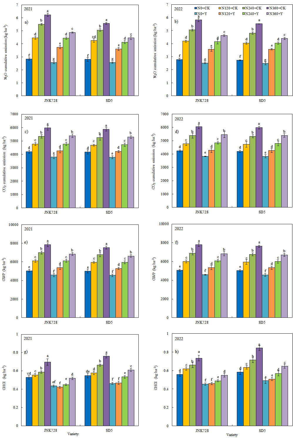 2.5.2. N2O and CO2 Cumulative Emission, Global Warming Potential (GWP), Greenhouse Gas Intensity (GHGI)