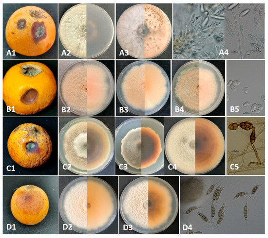The naturally infected symptoms, colony features, and conidial characteristics of the Botryosphaeria, Trichothecium, Alternaria, and Pestalotiopsis species isolated from loquat fruit rot. (A1–A4) correspond to Botryosphaeria dothidea; (B1–B5) correspond to Trichothecium roseum; (C1–C5) correspond to Alternaria alternata; (D1–D4) correspond to Pestalotiopsis kenyana. Bars = 10 μm.
