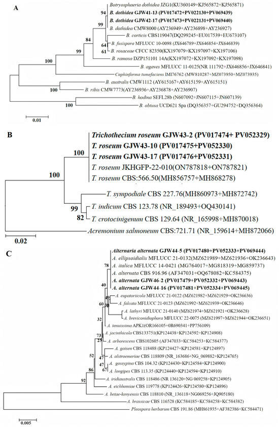 Colonies of GJW41-13 and GJW42-17 on PDA medium initially appeared white, with approximately circular or irregular margins at 27 °C. After three days of inoculation, the colonies GJW41-13 and 42-17 had diameters of 8.00cm and 9.00cm, respectively, and gradually became dark gray, with dense aerial mycelium. Their conidia were hyaline, subcylindrical, aseptate, and 17.5–24.1 × 5.7 to 7.2 μm, L/W = 2.7–4.1 (mean 21.0 × 6.6 μm, average L/W = 3.2, n = 30), like Botryosphaeria dothidea [(20-)23-27(-30) × 4-5(-6) (mean 26.2 × 5.4 μm)] [43]. Colonies of GJW43-2, GJW43-10, and GJW43-17 on PDA medium appeared light orange-red, with an orange powder and an irregularly rounded margin at 27 °C. After three days of inoculation, their colony diameters were 2.85 cm, 2.91 cm, and 2.54 cm, respectively. Their conidia were clusters, smooth, hyaline, thick-walled, ellipsoid to pyriform, 9.1–16.3 × 4.5–8.8 μm, L/W = 1.4–2.6 (mean 12.8 × 6.3 μm, average L/W = 2.1, n = 30), which was similar to Trichothecium roseum (10 to 18 × 7 to 9.5 μm) [44]. Colonies of GJW44-5, GJW44-16, and GJW46-2 on PDA medium appeared grayish-brown, white to gray with a flocculent texture on the front side, and a dark gray underside at 27 °C. After 3 days of inoculation, their colony diameters were 3.36 cm, 2.79 cm, and 3.58 cm, respectively. Their conidia were yellow-brown or black-brown, obclavate, subglobose, or ellipsoid, with 1–5 transverse septa and 1–3 longitudinal septa, 13.4–42.9 × 7.7–22.0 µm, L/W = 1.5–4.6 (mean 27.6 × 13.5 µm, average L/W = 2.8, n = 30), chain-typed, produced singly, separated, and pale brown conidiophores, which were similar to Alternaria alternata [26–30 × 5–9 µm with 4–7 transverse septa and a few or no longisepta] [45]. Colonies of GJW67-9 and GJW67-12 on the PDA medium were white and pale yellow on the reverse side at 27 °C. After three days of inoculation, the colony diameters were 3.33 cm and 3.28 cm, respectively. Pycnidia were black and scattered on the mycelial mats after 15–20 d. Conidia were fusoid, ellipsoid, straight or slightly curved, 4-septate, 20.9–27.6 × 4.0–5.4 µm, L/W = 4.5–6.9 (mean 24.3 × 4.6 µm, average L/W = 5.5, n = 20); three median cells were darker than other cells; the apical cell with 2–3 tubular appendages (mainly three) ranged from 6.6 to 16.3 µm, and the basal cell had one tubular appendage, ranging from 4.1 to 7.6 µm, which was similar to Pestalotiopsis kenyana [17.5–22 × 6–7 µm (mean 20 × 6.5 µm)] (Table 2) [46].