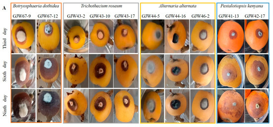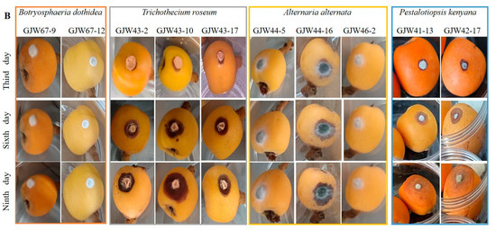Artificially infected fruits of loquat with wounded inoculation and non-wounded inoculation, with mycelial plug. (A) The symptoms of artificially infected fruits with wounded inoculation with the mycelial plugs of Botryosphaeria dothidea GJW67-9 and GJW67-12, Trichothecium roseum GJW43-2, GJW43-10, and GJW43-17, Alternaria alternata GJW44-5, GJW44-16, and GJW46-2, Pestalotiopsis kenyana GJW41-13 and GJW42-17, respectively. (B) The symptoms of artificially infected, non-wounded inoculated fruits with the mycelial plugs of B. dothidea GJW67-9 and GJW67-12, T. roseum GJW43-2, GJW43-10, and GJW43-17, A. alternata GJW44-5, GJW44-16, and GJW46-2, P. kenyana GJW41-13 and GJW42-17, respectively. All treatments were maintained at 27 °C with a relative humidity of 60% under normal light conditions.