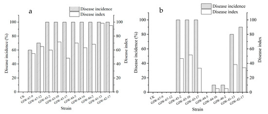 Incidence rate and disease index of postharvest fruit rot artificially infected with the mycelial plug of Botryosphaeria dothidea GJW67-9 and GJW67-12, Trichothecium roseum GJW43-2, GJW43-10, and GJW43-17, Alternaria alternata GJW44-5, GJW44-16, and GJW46-2, Pestalotiopsis kenyana GJW41-13 and GJW42-17, respectively. (a) All the treatments were inoculated on wounded sites; (b) all were inoculated on non-wounded sites.