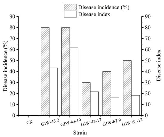 Disease incidence and disease index of Alternaria alternata GJW44-5, GJW44-16, and GJW46-2 at 25 °C.