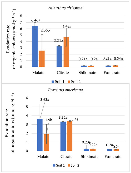 Mean exudation rate (µmol·g−1·h−1 ± SE) of organic anions in root exudates of the species Ailanthus altissima and Fraxinus americana grown in soil with low (Soil 1) and adequate (Soil 2) degrees of phosphorus concentration in the soil. Different letters indicate statistically significant differences (p < 0.05) based on ANOVA and the LSD test.
