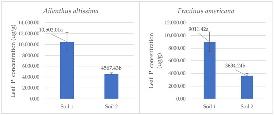 Mean phosphorus concentrations (µg·g−1 ± SE) in leaf tissue of the species Ailanthus altissima and Fraxinus americana grown in soil with low (Soil 1) and adequate (Soil 2) phosphorus availability. Different letters indicate statistically significant differences (p < 0.05) based on ANOVA and the LSD test.