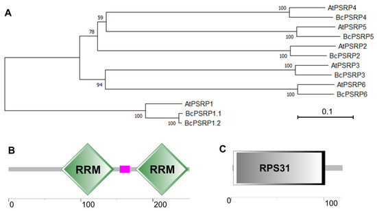The non-heading Chinese cabbage (NHCC001) protein database [] was searched using BLASTP v2.10.0+ (e-value < 1 × 10−50) with Arabidopsis PSRPs [] as the query. The selected BcPSRPs were evolutionarily analyzed by clustering using MEGAX [] and the maximum likelihood method. Protein structure domain was forecasted using SMART (https://smart.embl.de//).