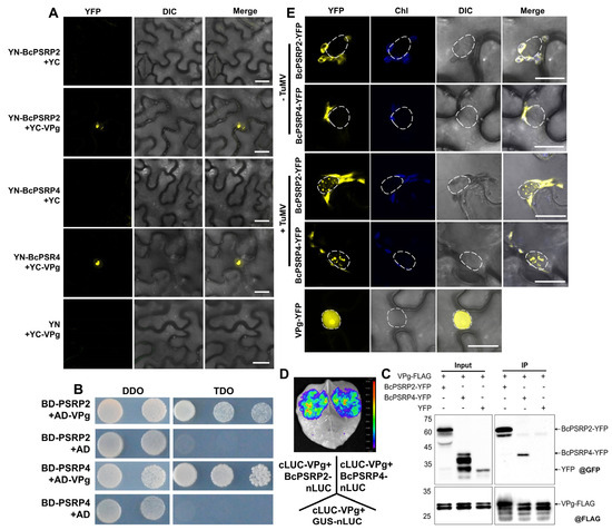 To investigate the interaction between BcPSRP2/4 and VPg proteins, we employed a co-immunoprecipitation (Co-IP) assay in N. benthamiana leaves with some modifications []. Constructs of BcPSRP2/4-YFP and VPg-FLAG were transformed into Agrobacterium tumefaciens strain GV3101 and cultured to an OD600 of 0.5. Equal volumes of bacterial suspensions were mixed and co-infiltrated into 4-week-old N. benthamiana leaves. After 48 h, leaf samples (1 g per sample) were harvested, ground in liquid nitrogen, and extracted in lysis buffer. Cleared lysates were incubated with anti-FLAG M2 affinity gel (Sigma-Aldrich, St. Louis, MO, USA) at 4 °C for 2 h. Immunoprecipitated proteins were eluted by boiling in 2× SDS loading buffer for 10 min, separated by SDS-PAGE, and analyzed by immunoblotting using anti-FLAG M2 (1:10,000, Sigma-Aldrich) and anti-GFP (1:3,000, Yeasen Biotech, Shanghai, China) antibodies. A YFP empty vector was used as a negative control to confirm the specificity of the interaction.