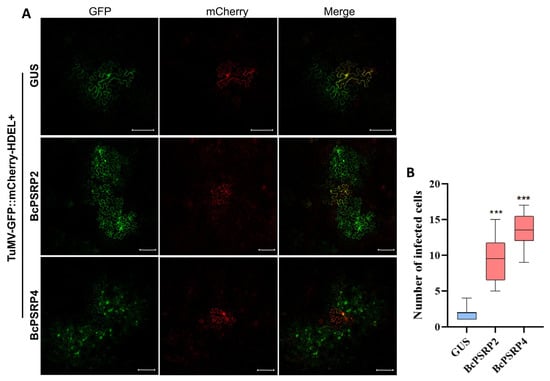 Here, we used TuMV-GFP//mCherry-HDEL to examine the movement of the virus. It is designed as a dual-expression system to facilitate visualization of viral and cellular components in N. benthamiana leaf cells []. This construct contains two distinct expression cassettes driven by the CaMV 35S promoter: one drives the production of mCherry fused to an endoplasmic reticulum (ER) retention signal (mCherry-HDEL), localizing red fluorescence to the ER lumen, and the other encodes the TuMV genome tagged with green fluorescent protein (GFP). Upon agroinfiltration into leaf cells, the 35S promoter enables initial transcription of both cassettes in primary infected cells, producing authentic viral RNA from the TuMV-GFP cassette that replicates and spreads via progeny virions lacking the promoter sequence. This results in distinct green fluorescence from the TuMV-GFP and red fluorescence from mCherry-HDEL, allowing clear visualization of their respective localizations. As shown in Figure 5A,B, co-expression of TuMV-GFP//mCherry-HDEL with BcPSRP2/4 significantly enhanced viral cell-to-cell movement compared to the GUS-negative control (p < 0.0001). Quantitative analysis revealed that GFP-tagged viral particles exhibited an expanded distribution pattern in BcPSRP2/4-overexpressing cells, whereas the movement of GFP-tagged viral particles was highly restricted in GUS-expressing controls (Figure 5A). This distinct movement phenotype suggests that BcPSRP2/4 may either facilitate the viral movement machinery or modulate plasmodesmal permeability to promote intercellular trafficking, as reported in a recent study [].