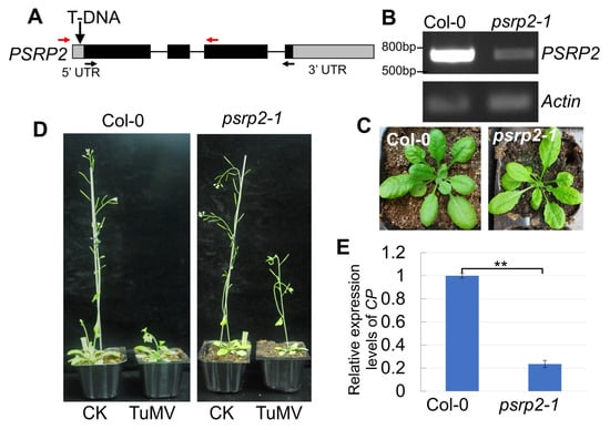 Down-regulation of PSRP2 is associated with milder disease symptoms in Arabidopsis. (A) Schematic representation of the T-DNA insertion site in the Arabidopsis psrp2-1 mutant line, showing disruption of the AtPSRP2 5′UTR region. Red arrows indicate genotyping primers LP/RP flanking the T-DNA insertion site. Black arrows denote RT-PCR primers F/R for AtPSRP2 expression quantification. (B) RT-PCR analysis confirms a significant reduction in the AtPSRP2 transcript level in the psrp2-1 mutant compared to wild-type Col-0 plants, using Actin as an internal control. (C) Comparative phenotypic analysis revealed no developmental abnormalities in psrp2-1 mutants under normal growth conditions. (D) Typical viral symptom development following pathogen inoculation in psrp2-1 mutants. CK represents the negative control without TuMV infection. (E) Viral challenge assay demonstrating milder symptoms upon TuMV infection in the psrp2-1 mutant. Quantitative detection of viral coat protein (CP) gene accumulation by qRT-PCR (** p < 0.01), normalized to Actin expression.