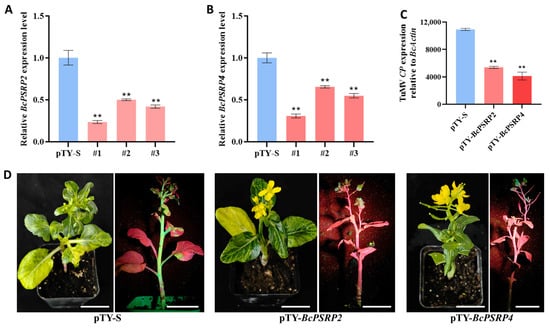The functional analysis of BcPSRP2 and BcPSRP4 genes was conducted using an optimized virus-induced gene silencing (VIGS) protocol []. Target-specific 40-mer oligonucleotides corresponding to conserved regions of BcPSRP2 (CTGAAGAAAAACCCGCTTCAGACCCTAACGCAGAGTCCTC) and BcPSRP4 (CTAATCGGAGCTCCTCCGCGACTCACCGTCCCATCATCTT) were designed to generate an 80 bp inverted repeat structure through reverse complementation. Recombinant pTY-BcPSRP2/4 vectors were commercially synthesized (GenScript, Nanjing, China) and amplified in E. coli. Plasmid DNA was purified using a commercial extraction kit (Tiangen Biotech, Beijing, China) for subsequent transformations. Gold microparticles (1.0 μm) coated with recombinant plasmids were ballistically introduced into two-true-leaf-stage plants using a helium-driven gene delivery system (Bio-Rad PDS-1000/He, Hercules, CA, USA). The bombardment parameters were as follows: a target distance of 9 cm, a helium gas pressure of 8.96 MPa (1300 psi), and a vacuum pressure of 0.36 MPa (26 inHg). Each construct was tested on six biological replicates per experiment across three independent trials. Systemic symptom development was monitored for 14 days post-bombardment, after which leaves exhibiting characteristic viral-induced phenotypes were harvested for molecular validation. Quantitative reverse transcription PCR (qRT-PCR) was performed to assess transcript suppression efficiency relative to empty vector controls (pTY-S). Significantly down-regulated plants were inoculated as above with TuMV. After the plants developed typical TuMV symptoms, viral accumulation was quantified by qRT-PCR targeting the CP gene.