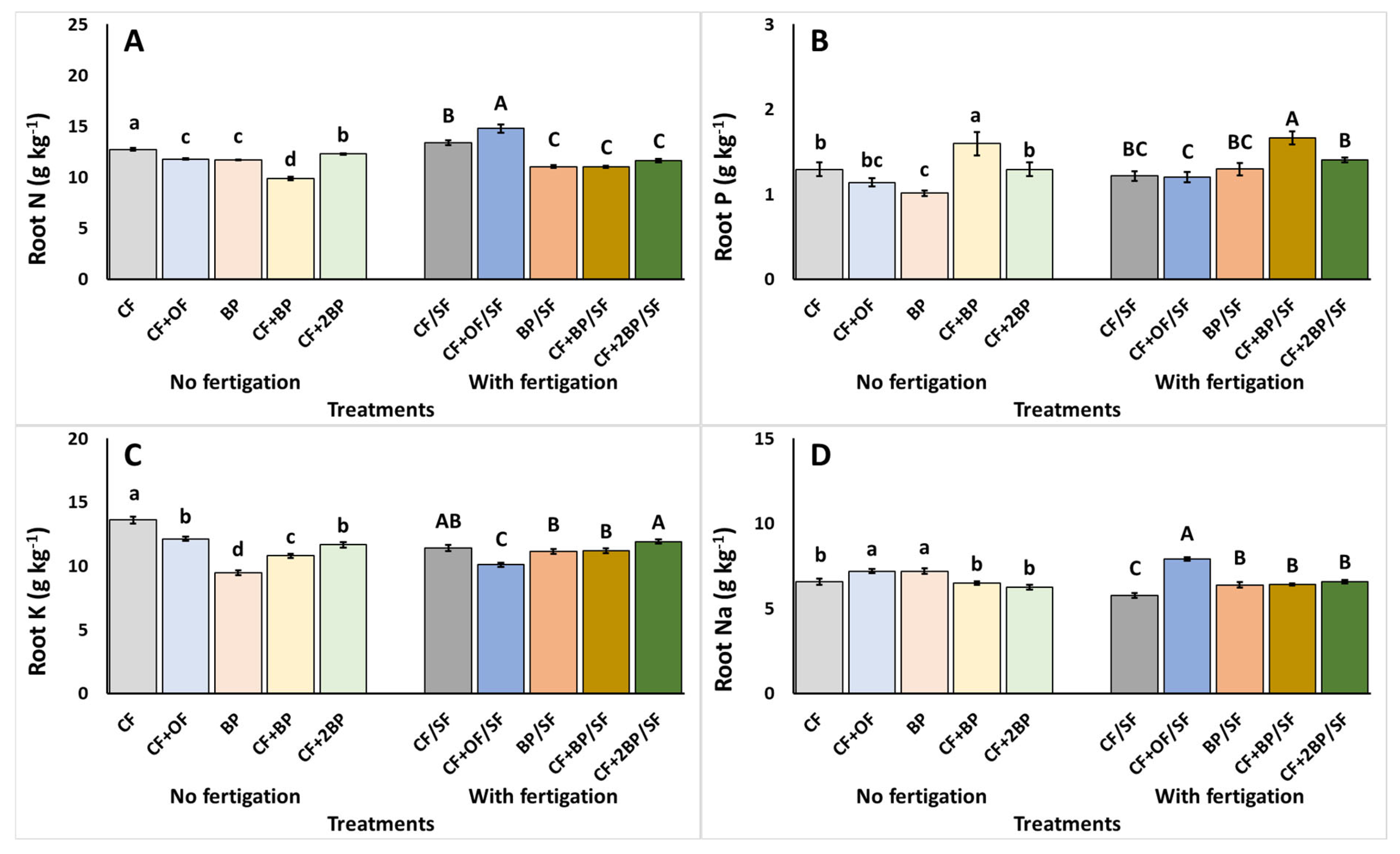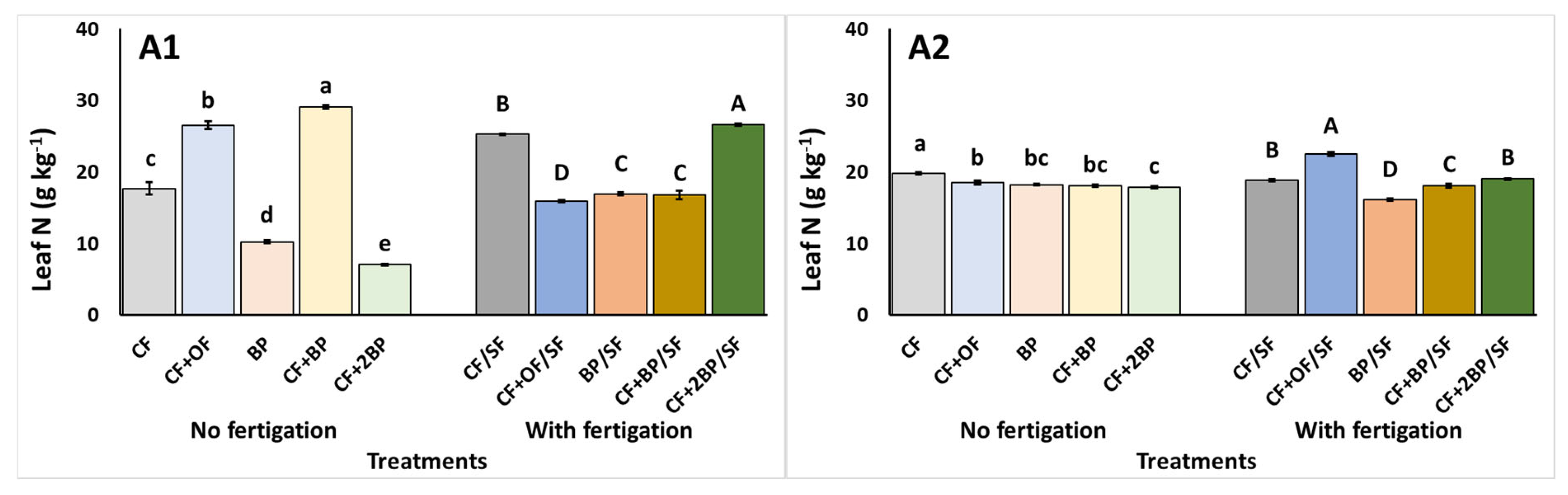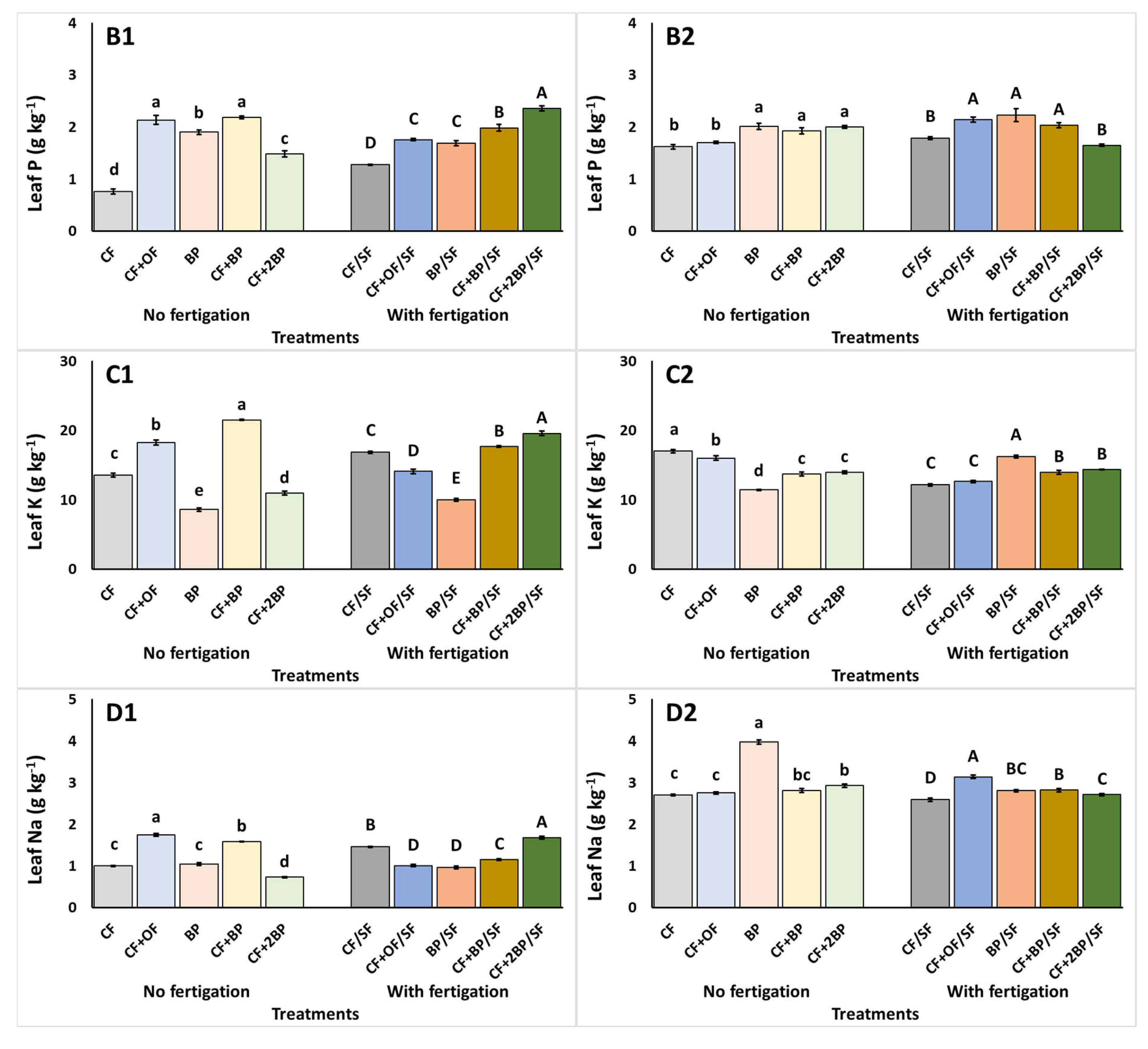 CF + 2BP/SF | 200.33 ± 7.32 A | 17.44 ± 0.94 A | 12.24 ± 0.30 A | 6.26 ± 0.70 | 69.21 ± 6.07 A | 0.72 ± 0.01 AB |